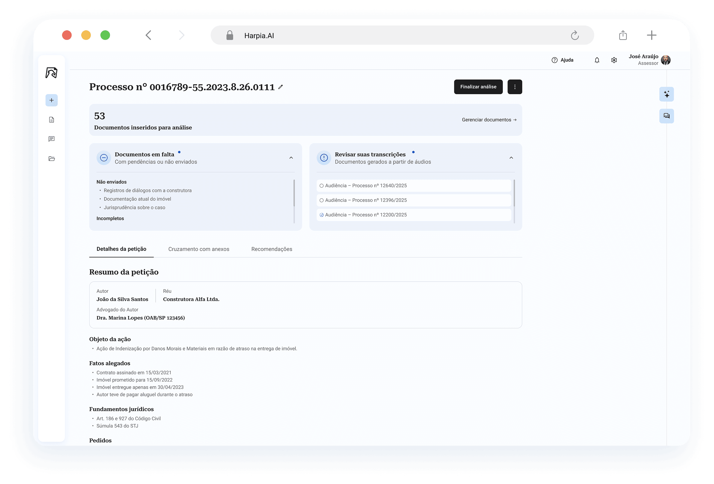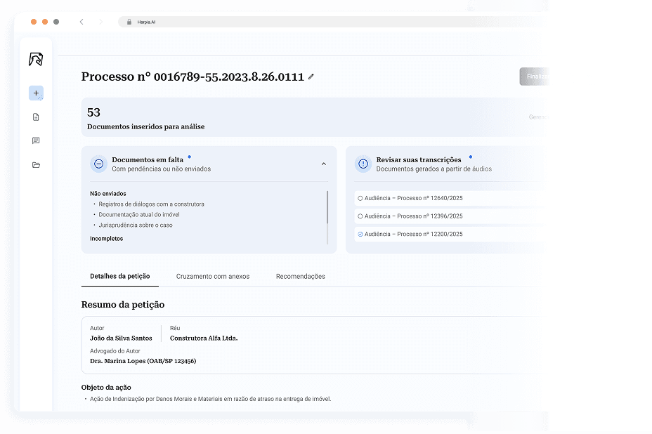 A Harpia.IA analisa processos, compara documentos e automatiza sua rotina jurídica com precisão técnica e total segurança.